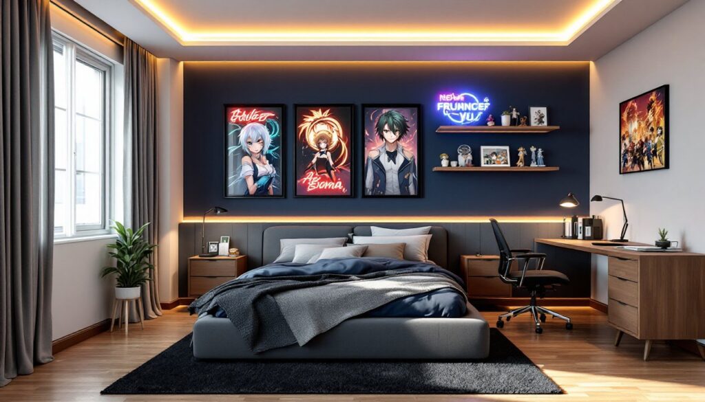 Bed as a Centerpiece: The bed is the largest furniture piece and deserves strategic placement. A upholstered platform bed in a complementary color (charcoal, navy, or soft gray) anchors the room without competing with posters. Anime-themed bedding options are covered in the next section: for now, ensure the frame isn’t a visual clutter distraction.